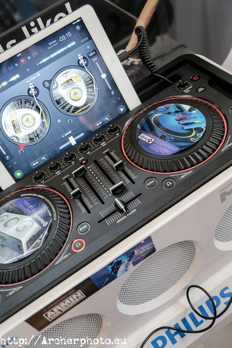 Vino a presentar una mesa de mezclas de Philips en la que ha estado participando en el diseño, la M1-XDJ, un invento que permite, iPad o iPhone mediante, el trabajo completo del DJ, facilitando las mezclas e incluyendo tres altavoces con una potencia total de 80W RMS, que es una potencia respetable para una pequeña fiesta. El aparato se conecta a la red eléctrica, pero si lo que te gusta es perderte en sitios que no tengan enchufe, puedes cargar el aparato con pilas. Y, si tus amigos tienen un par de M1-XDJ más, puedes apilar los altavoces sumando la potencia.