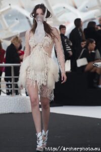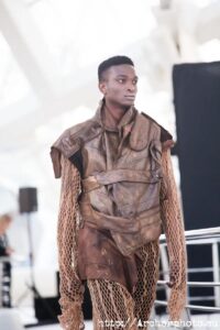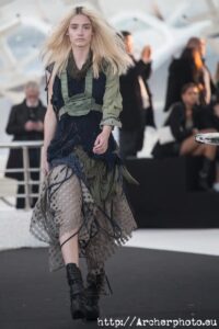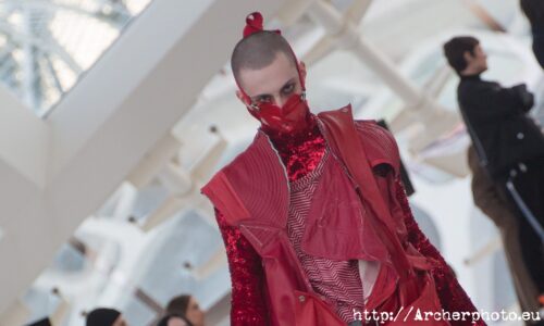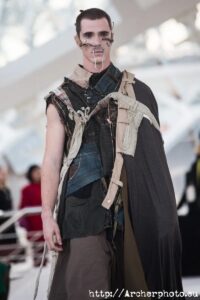 Javier Soria es el artífice de Visori, quien bajo este nombre lleva la moda al extremo. El polifacético diseñador no dejó indiferente a nadie con su desfile. Desde el minuto cero, Visori envolvió al espectador en lo más profundo de la sociedad de un futuro distópico. Personas que luchan por sobrevivir en la más profunda decadencia y seres que rozaban lo diabólico se representaron en este desfile. Películas como “Blade Runner” o “Mad Max” y series más recientes como “The Expanse”, me vinieron a la cabeza mientras sus modelos inundaban la pasarela con esa estética caótica y transgresora que muestran estas grandes producciones audiovisuales de ciencia ficción. Me encantó su carrusel final. ¡De película!