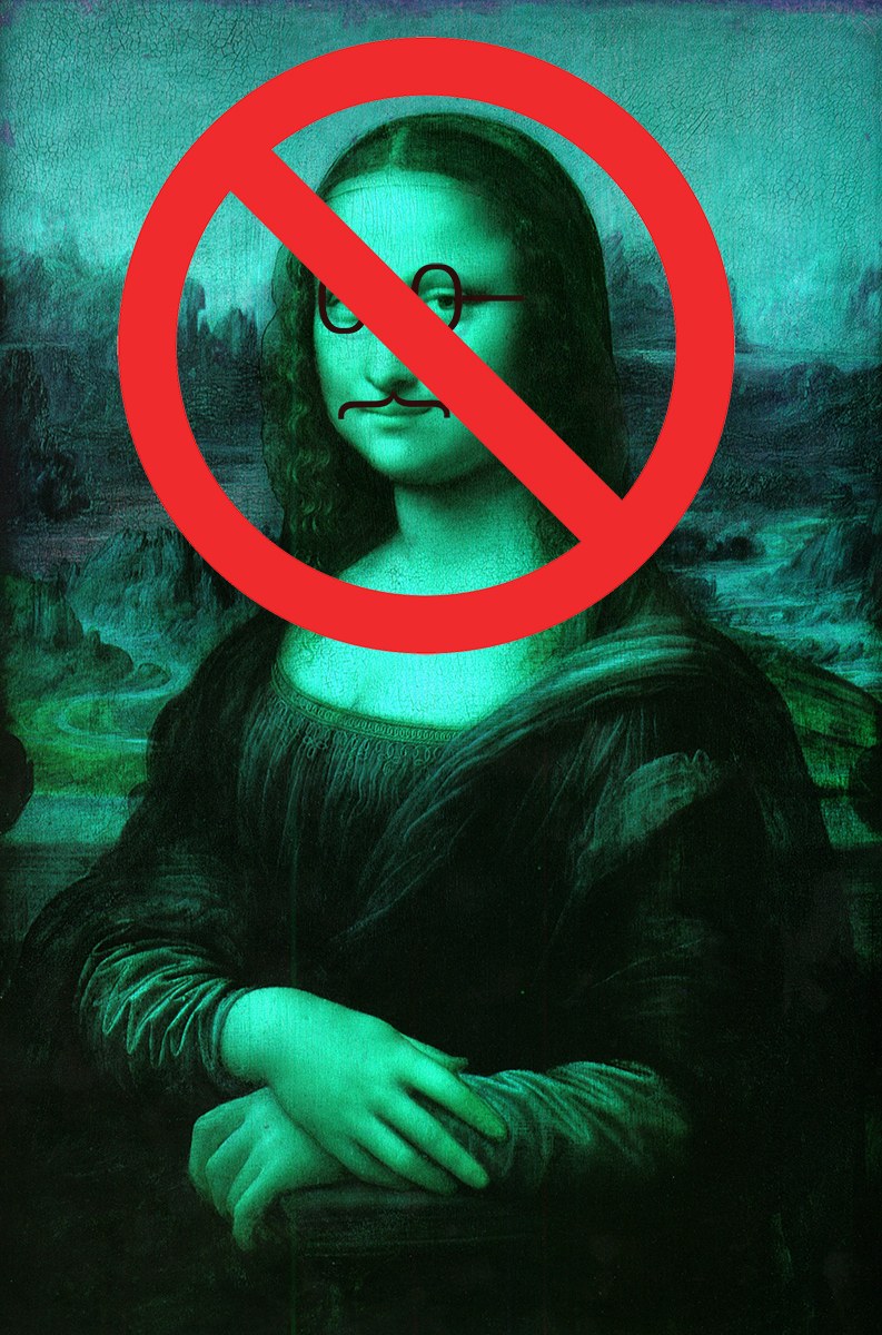 Tal vez pienses que eres un artista y una persona con un buen gusto especial, pero, claro ¿quién no diría eso de sí mismo? No puedes imaginar el daño que le causa a un autor que destroces sus fotos, ilustraciones o textos creando composiciones que a ti te parecen maravillosas pero que se dedican a cercenar obras ajenas. Si quieres hacer tus propias composiciones, emplea siempre tu propio material y no hagas sufrir a nadie. Por si la ética no fuese suficiente, que sepas que existe una cosa llamada propiedad intelectual que protege al autor. Aunque habitualmente no te vayan a denunciar por ello si es un perfil personal, si haces desastres en una página de Facebook o de Internet sí estás expuesto a que te obliguen a retirarlo y hasta a pagar indemnizaciones. Mona_Lisa_ruined_small