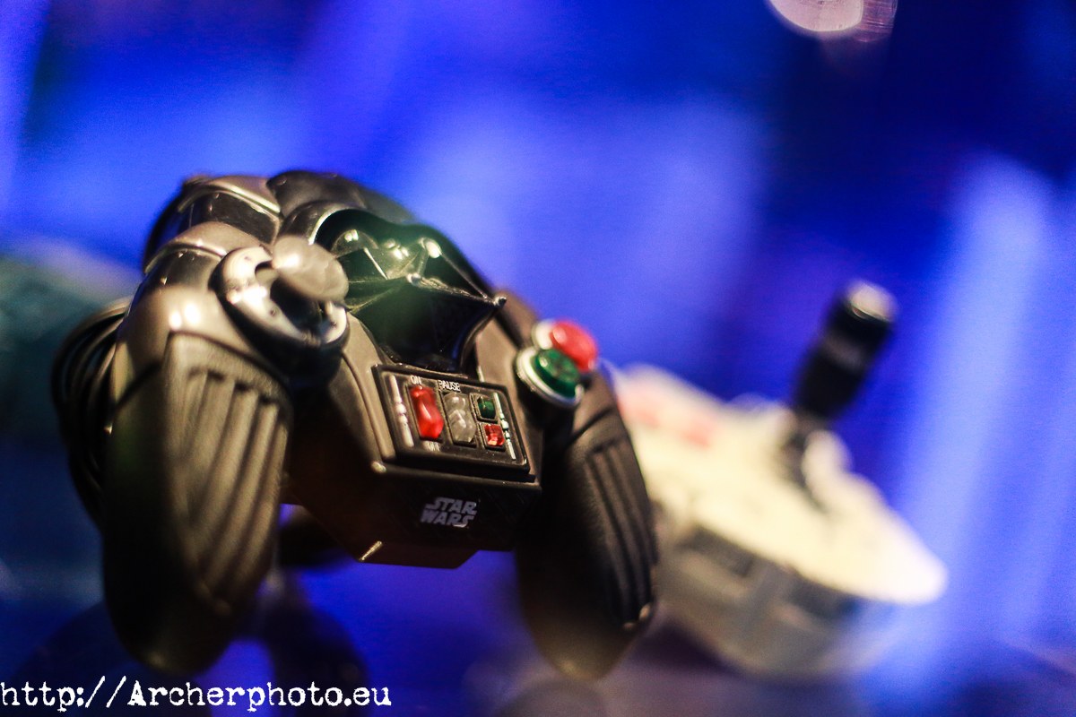 Joypad de Darth Vader. Al fondo, desenfocado, un joystick sobre la base del Millenium Falcon, o Halcón Milenario.